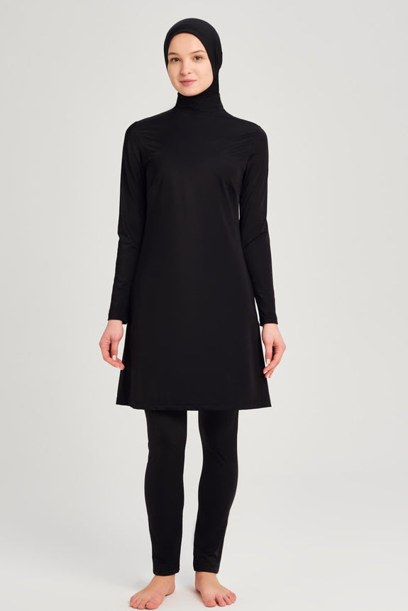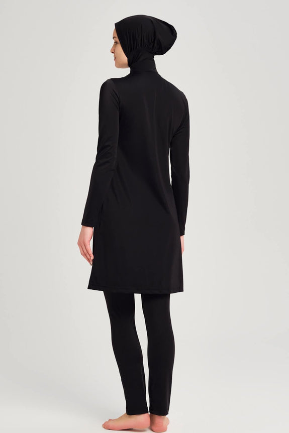 It includes adjustable waist stoppers for a customisable fit, a tie detail that connects the leggings to the tunic to keep the skirt in place while swimming, and inner leggings for added comfort.