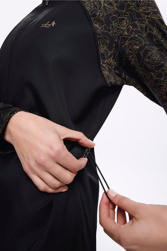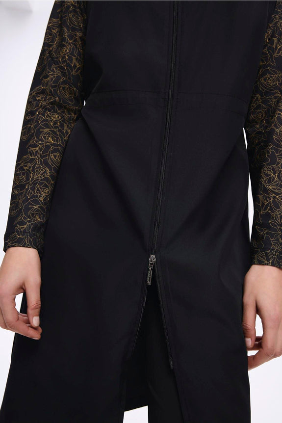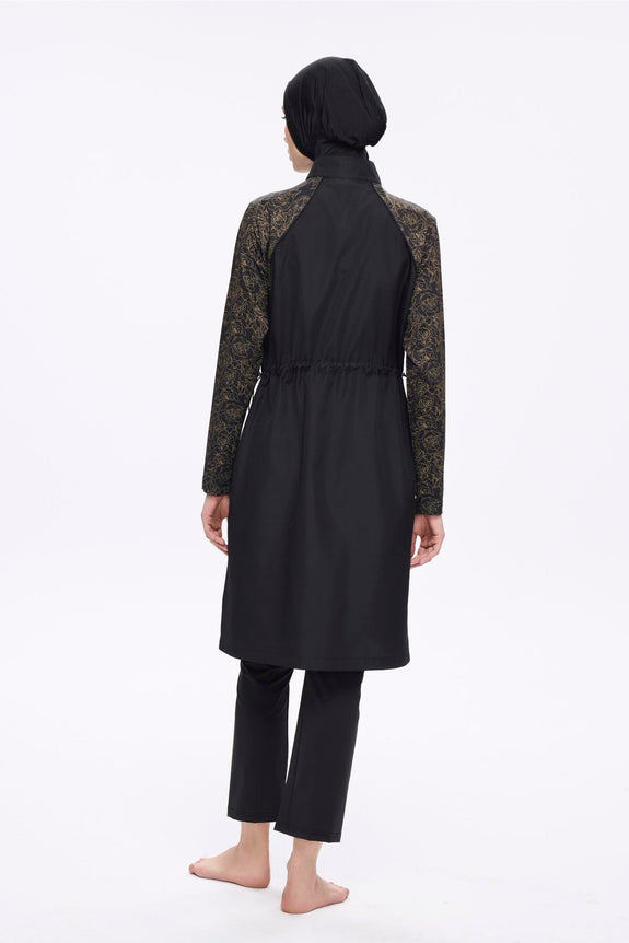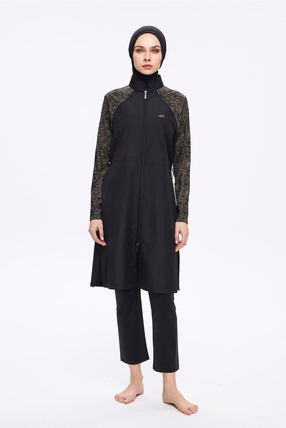 It includes adjustable waist stoppers for a customisable fit, a tie detail that connects the leggings to the tunic to keep the skirt in place while swimming, and knee-length inner leggings for added comfort.